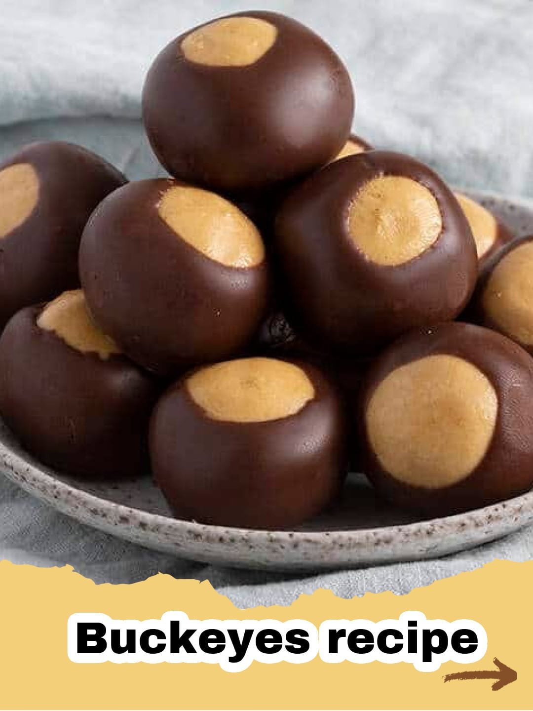 A Buckeye is a popular no-bake confection consisting of a sweet, creamy peanut butter fudge ball partially dipped in melted chocolate, leaving a small circle of peanut butter exposed. It's named for its resemblance to the poisonous nut of the Ohio Buckeye tree.