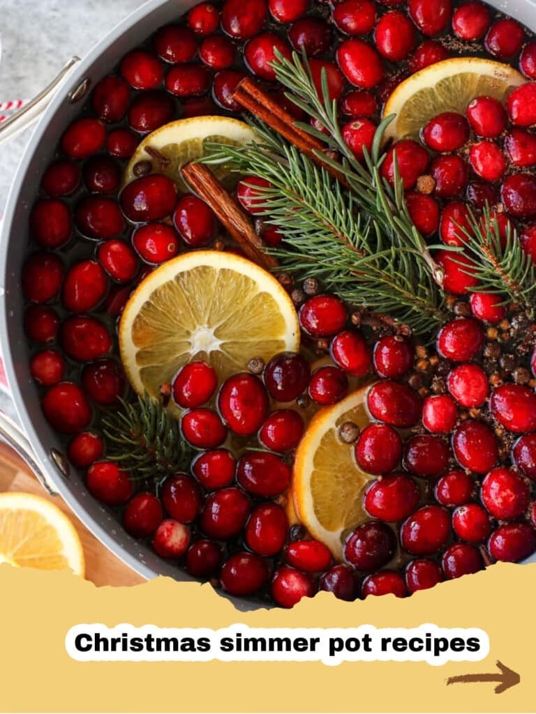 The best ingredients for a Christmas Simmer Pot include citrus (oranges, lemons), cranberries, cinnamon sticks, whole cloves, and fresh aromatics like rosemary or pine sprigs. Vanilla extract, star anise, and ginger slices can also enhance the fragrance. Feel free to customize your Christmas Simmer Pot Recipe with your favorite holiday scents.