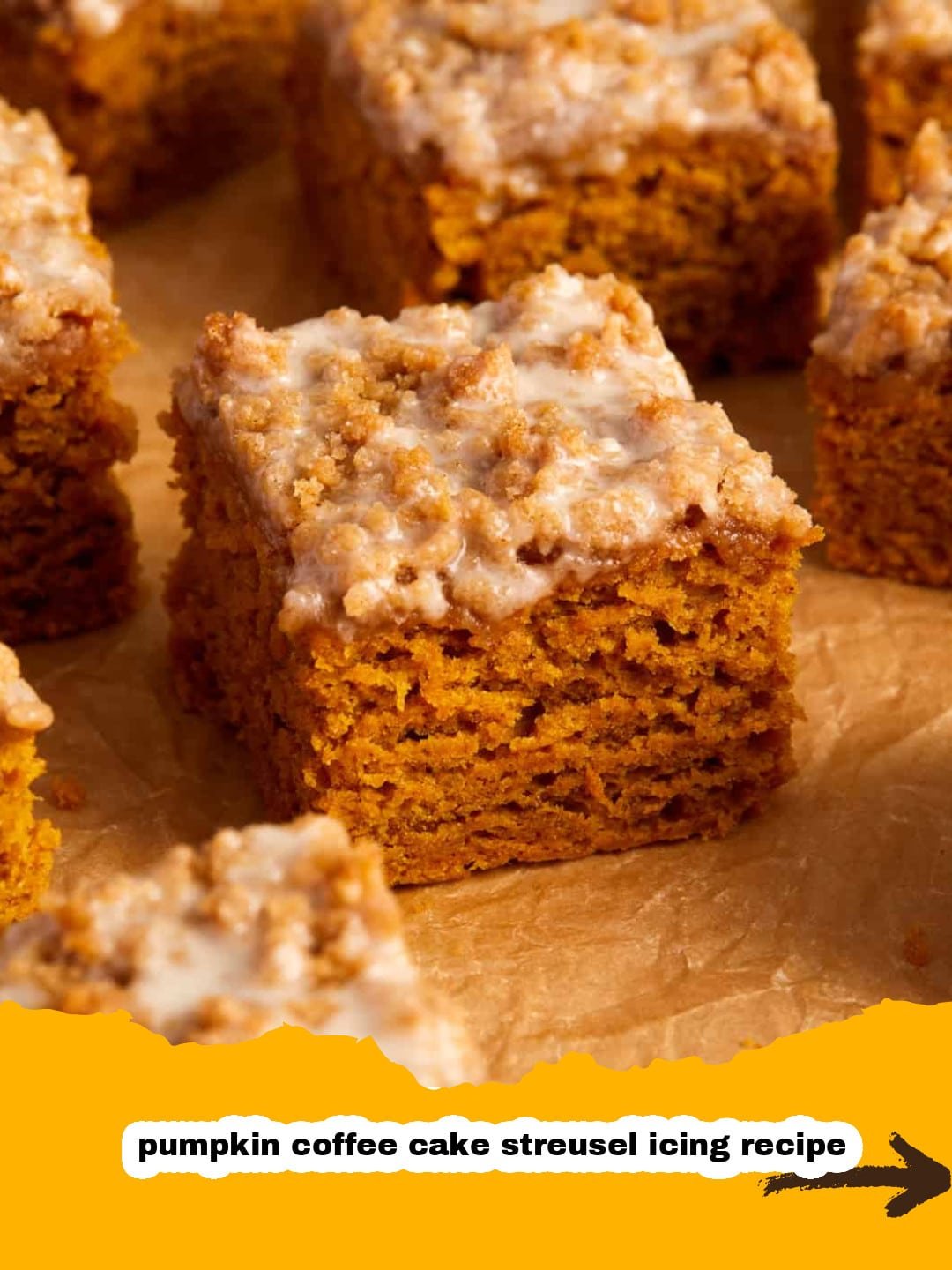 A delightful fall coffee cake featuring a moist pumpkin spice cake base, a generous layer of buttery cinnamon streusel in the middle, and a golden crumb topping. Perfect for breakfast, brunch, or dessert.