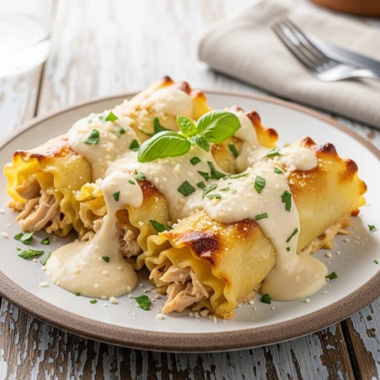Individual lasagna rolls filled with tender chicken, creamy ricotta, and rich Alfredo sauce, baked to cheesy perfection.