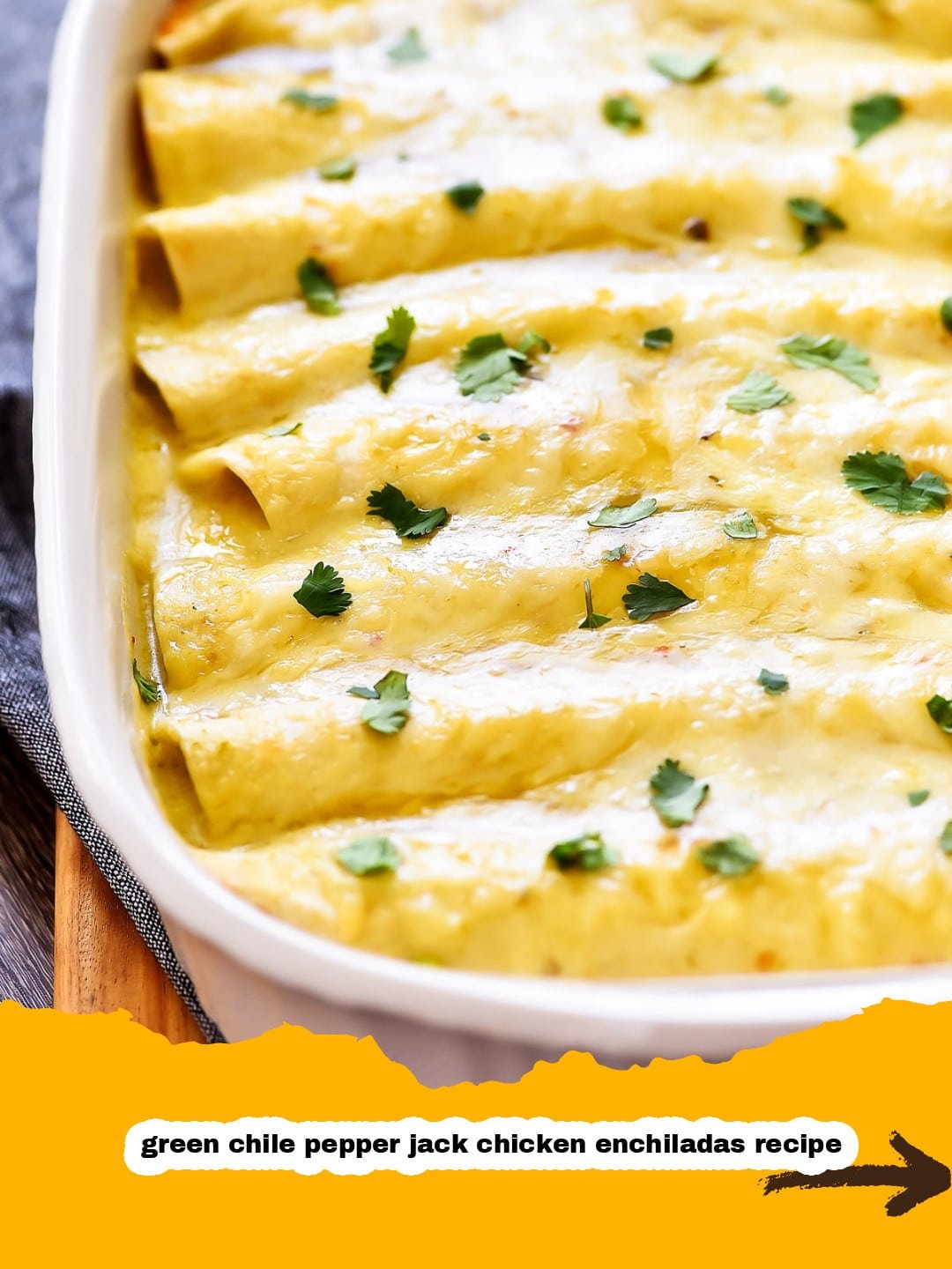 Step 7: Pour the remaining green chile cream sauce evenly over the rolled enchiladas. Sprinkle the remaining shredded Pepper Jack cheese over the top.