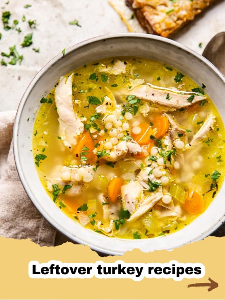 - Step 8: Finish and serve. Taste the Leftover Turkey Soup and adjust seasonings as needed. If desired, stir in a handful of fresh spinach or kale during the last few minutes of cooking until wilted. Ladle the hot Leftover Turkey Soup into bowls and garnish with fresh parsley or a sprinkle of Parmesan cheese. Enjoy your homemade Leftover Turkey Soup!