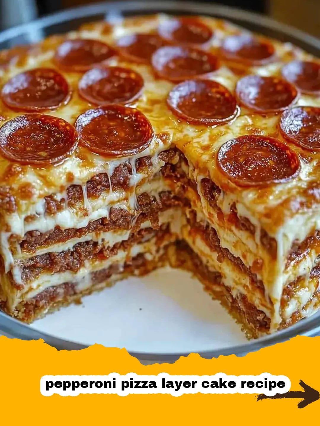 A towering, savory cake made from layers of pizza dough, rich marinara, melted mozzarella, and zesty pepperoni, offering a fun and impressive twist on classic pizza.