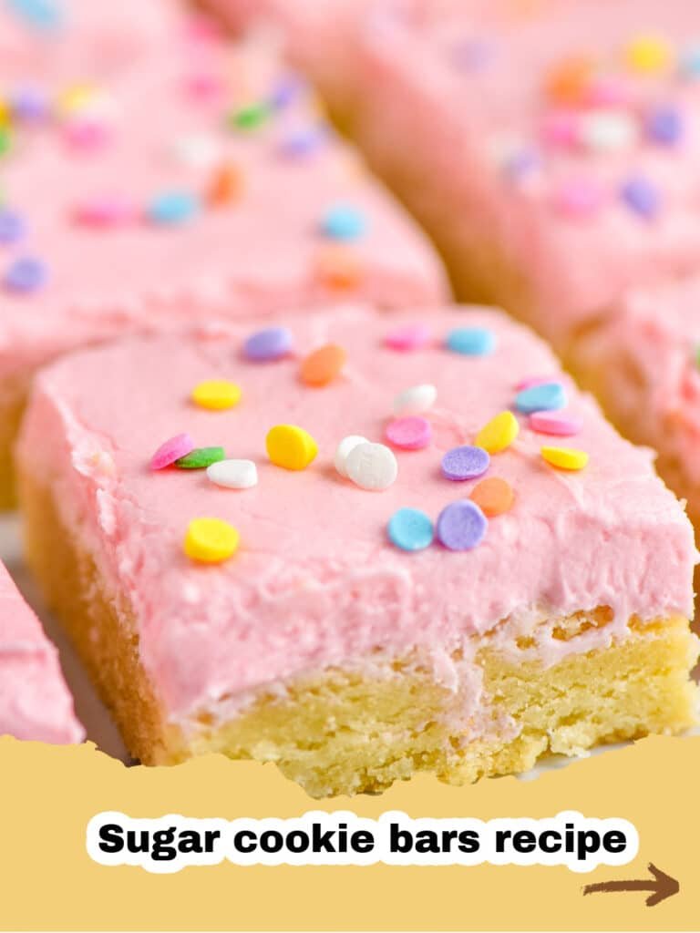 - Step 11: Once the bars are completely cool, spread the vanilla buttercream frosting evenly over the top. Decorate with your favorite sprinkles, if desired, to make your **Sugar Cookie Bars** extra festive!
