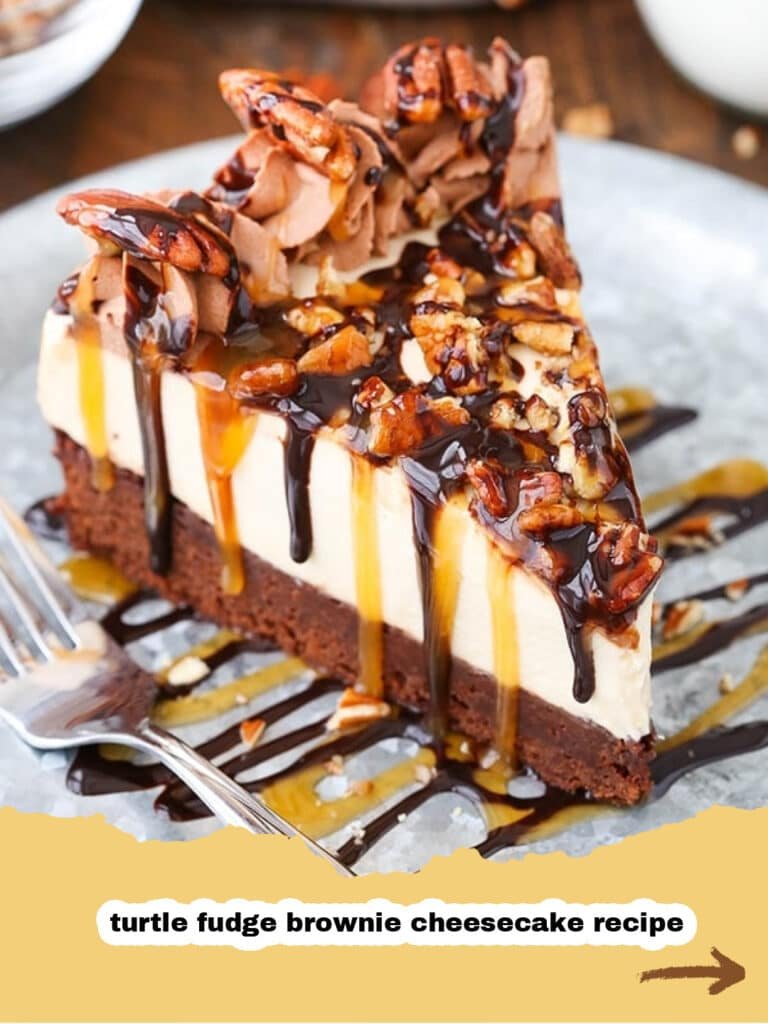 A Turtle Brownie Cheesecake is a decadent layered dessert featuring a fudgy chocolate brownie base, a rich and creamy vanilla cheesecake filling, topped with a generous layer of gooey caramel sauce, crunchy toasted pecans, and a drizzle of melted chocolate, mirroring the flavors of classic 'turtle' candies.