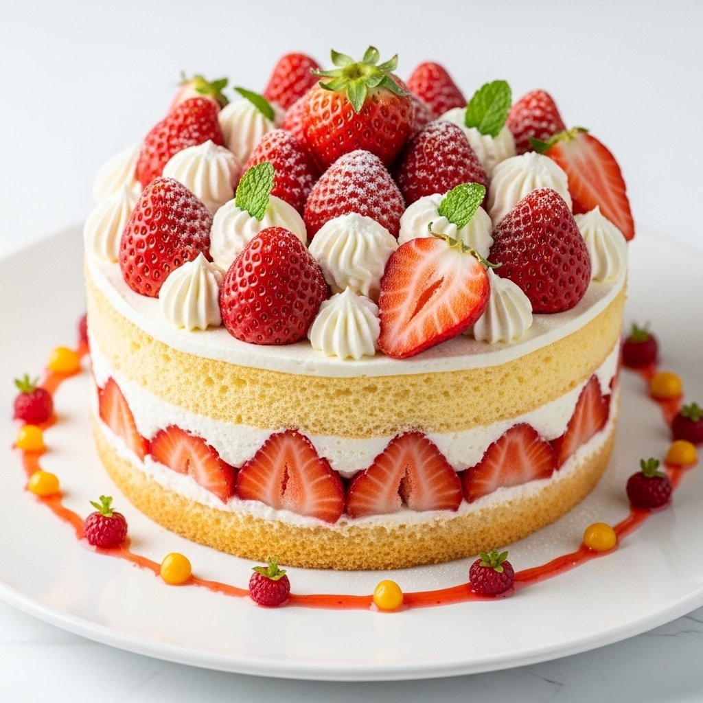A tender vanilla sponge cake layered with luscious whipped cream and abundant fresh, sweet strawberries, perfect for any occasion and a taste of summer bliss.